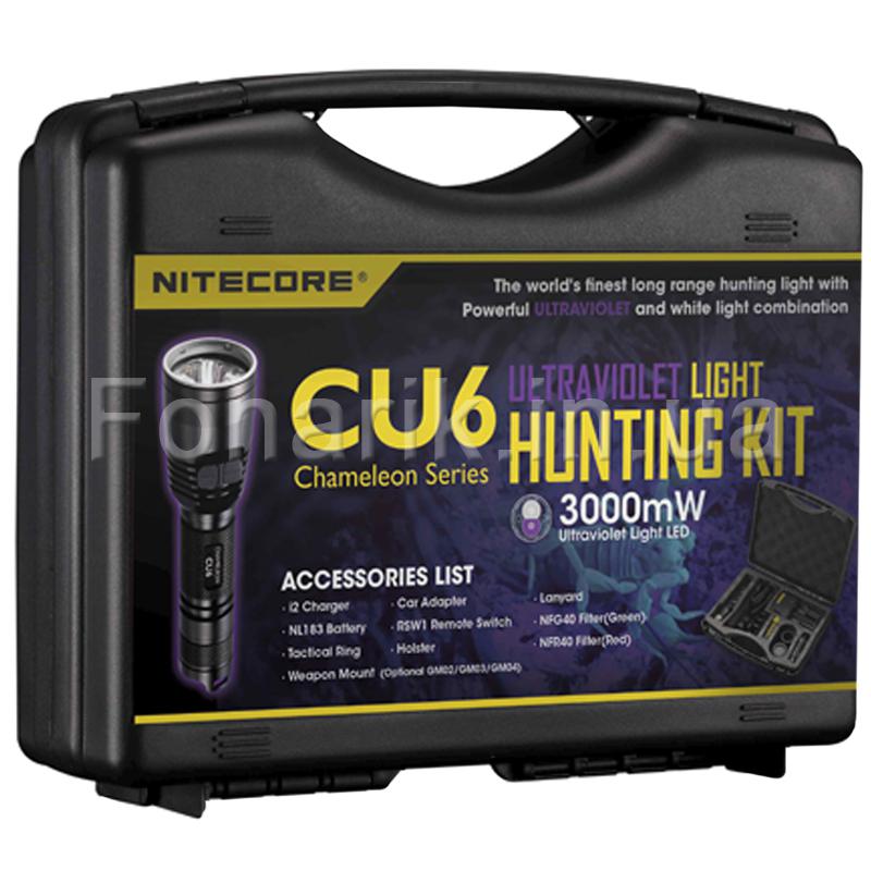 В набор для ночной охоты Nitecore CU6 вошли самые необходимые аксессуары для комфортного применения фонаря. Крепления на оружие и выносная тактическая кнопка позволяют использовать фонарь в качестве подствольного, наличие дополнительных фильтров позволяют применять фонарь в разных окружающих средах или погодных условиях, автомобильный адаптер позволяют заряжать аккумулятор от автомобильного прикуривателя, а пластиковый кейс обеспечивает сохранность комплекта.