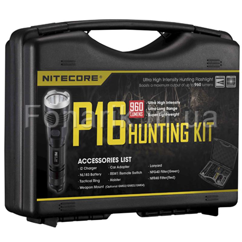 В набор для ночной охоты Nitecore P16 вошли самые необходимые аксессуары для комфортного применения фонаря. Крепления на оружие и выносная тактическая кнопка позволяют использовать фонарь в качестве подствольного, наличие дополнительных фильтров позволяют применять фонарь в разных окружающих средах или погодных условиях, автомобильный адаптер позволяют заряжать аккумулятор от автомобильного прикуривателя, а пластиковый кейс обеспечивает сохранность комплекта.