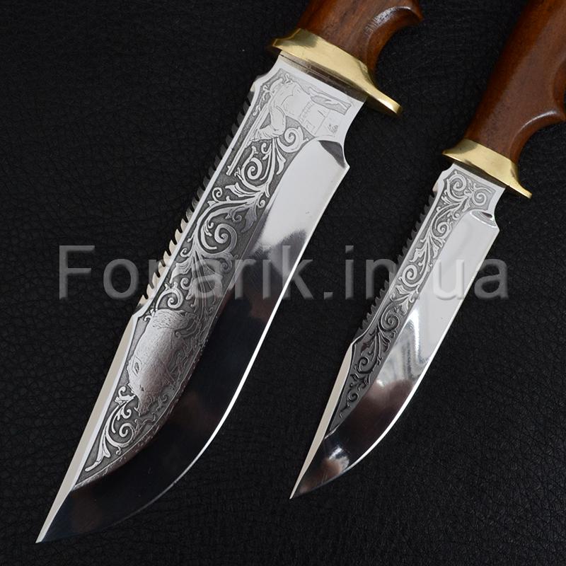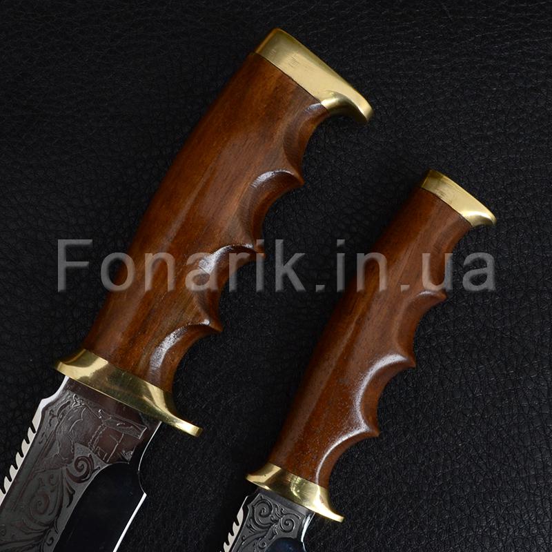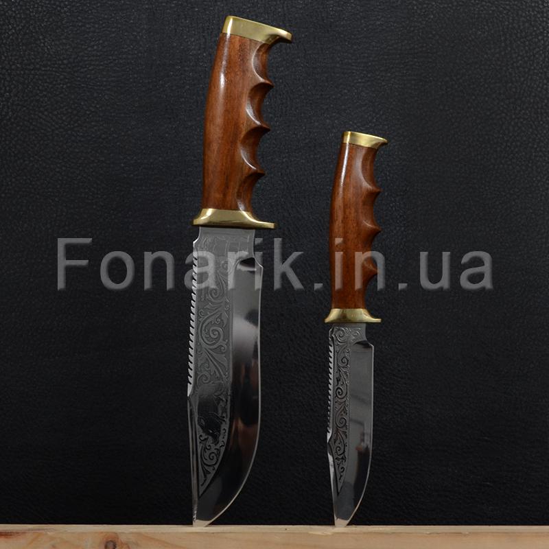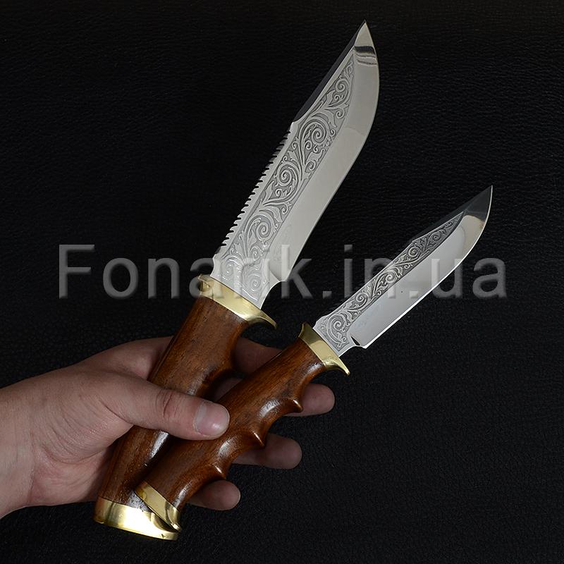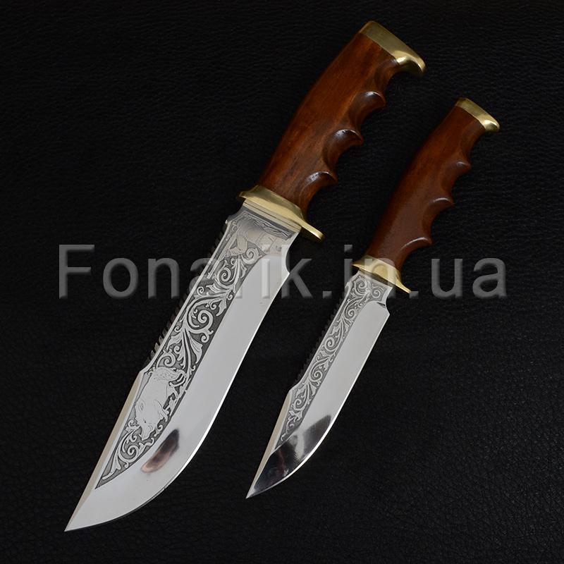 Набор ножей Спутник "Туризм-2" - поставляются сразу два ножа с разными габаритными размерами. На клинках имеется гравировка. Ножи функциональны, надежны, долговечны, изготовлены из нержавеющей стали AISI 420, которая проходит специальный цикл термообработки, и достигает твердости 55HRC. Рукоять сделана из ореха. В комплекте с ножом идут кожаные ножны и паспорт. Набор Спутник "Туризм-2" станут незаменимыми помощниками на пикнике, охоте или рыбалке.