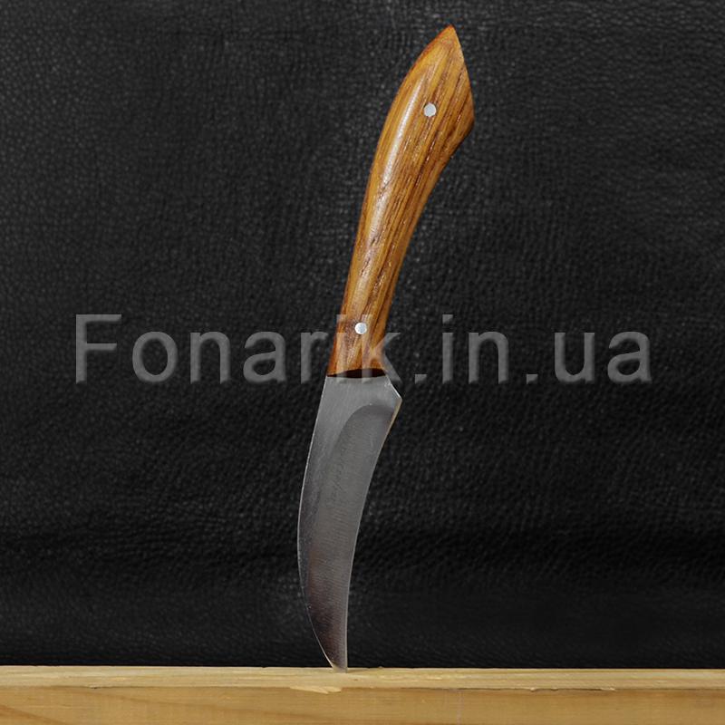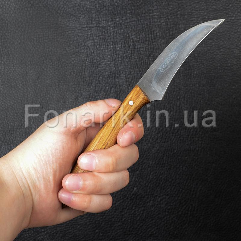 Нож для кореньев Спутник идеально подойдет для работы как на природе так и в быту. Изогнутый клинок идеально подходит для обработки круглых поверхностей. Лезвие отчищает от корки картофель, фрукты и овощи, снимает луковую шелуху. Острый изогнутый кончик вырезает картофельные испорченные места. Клинок изготовлен из стали AISI 420 не содержит в своем составе веществ и сплавов, которые вредны для здоровья человека, поэтому применяется для изготовления клинков, непосредственно контактирующих с пищевыми продуктами. Рукоять ножа имеет удобную форму, выполнена из древесины дуба, твердой и прочной, пропитанной защитным водоотталкивающим составом и покрыт лаком.