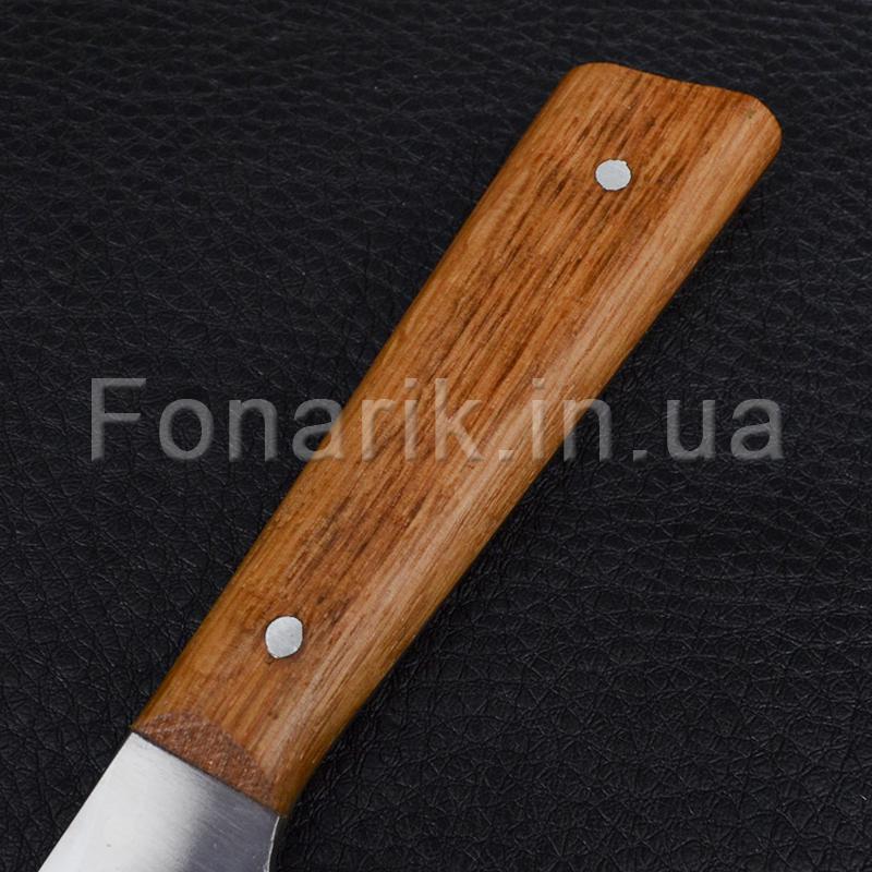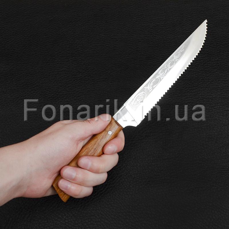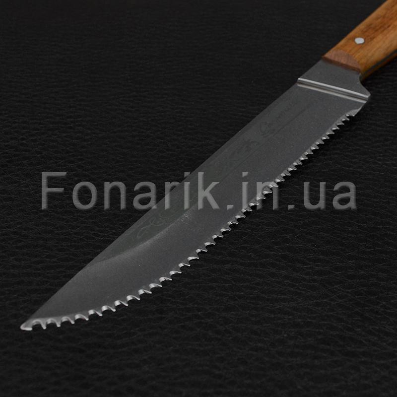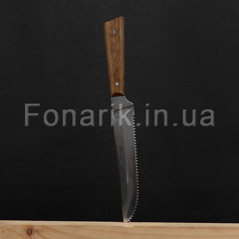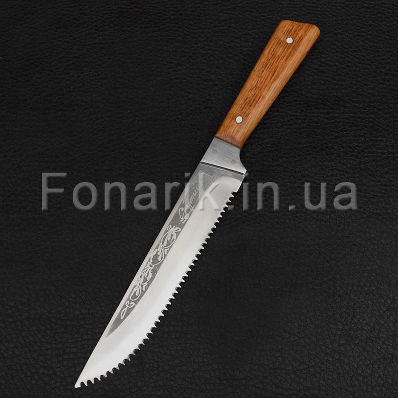 Бытовой кухонный нож с серрейторным заточкой из нержавеющей стали и притыном. Общая длина - 27см. Нож является незаменимым помощником не только на кухне, но и на пикнике для разрезания овощей или фруктов. Клинок изготовлен из нержавеющей высококачественной стали AISI 420, которая обладает высокой износостойкостью, хорошей коррозионной и жаростойкостью, пластичностью и высокой ударной вязкостью. При изготовлении ножа сталь проходит термообработку по специальному циклу, в процессе которого повышается износостойкость и твердость стали. Нож имеет так называемый притын - утолщение клинка в месте его соединения с рукояткой ножа. В прежние времена, этот элемент придавал необходимую жесткость конструкции и балансировал нож.