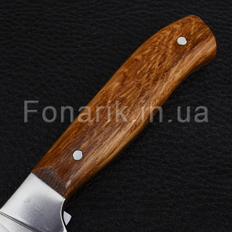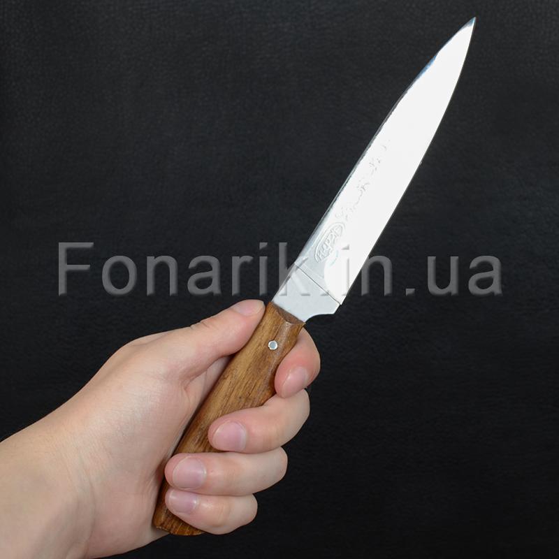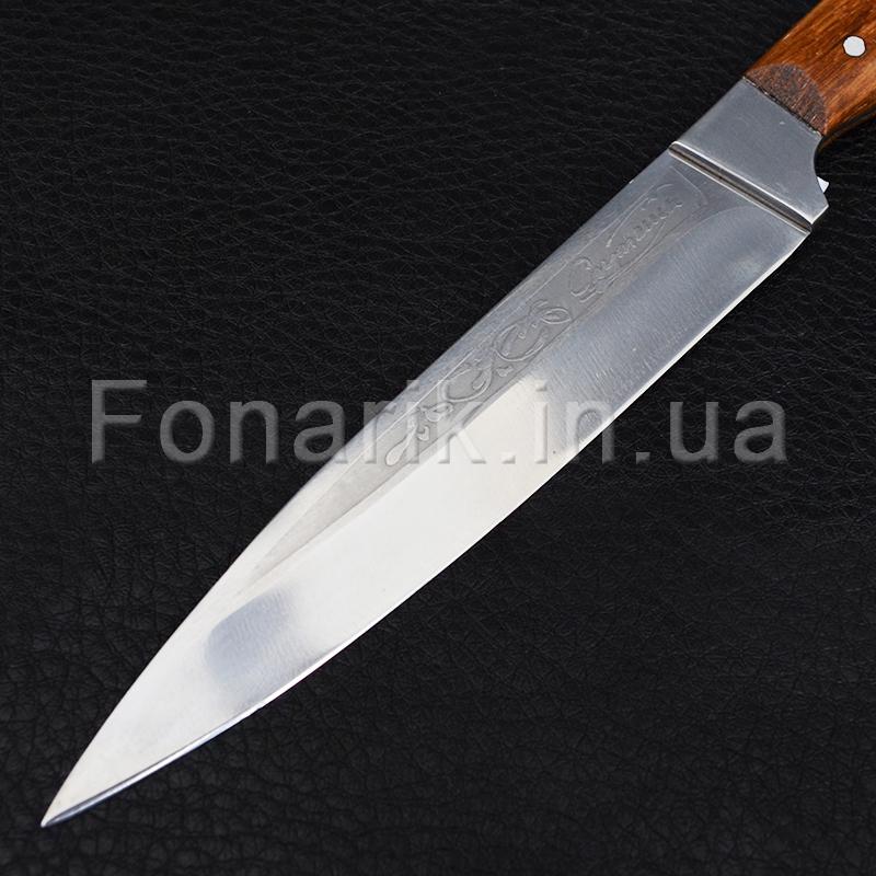 Разделочный нож Спутник предназначен для многих работ и является незаменимым помощником не только на кухне, но и на пикнике для разрезания овощей, фруктов и мяса. Клинок ножа изготовлен из стали AISI 420 (аналог 40Х13) и обладающей высокой износостойкостью, хорошей коррозионной и жаростойкостью, пластичностью и высокой ударной вязкостью.. Длина клинка составляет 180мм, общая длина ножа 260мм. Рукоять сделана из дуба