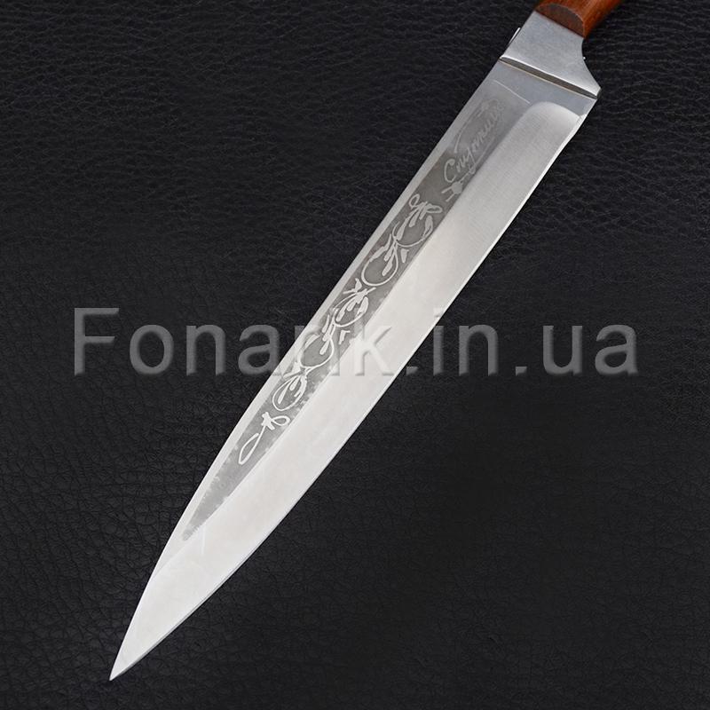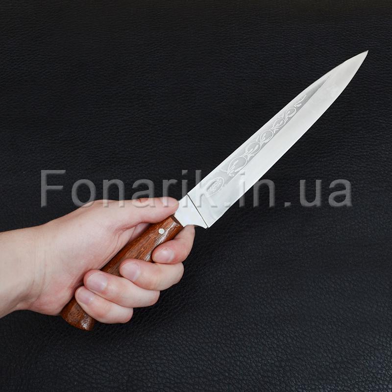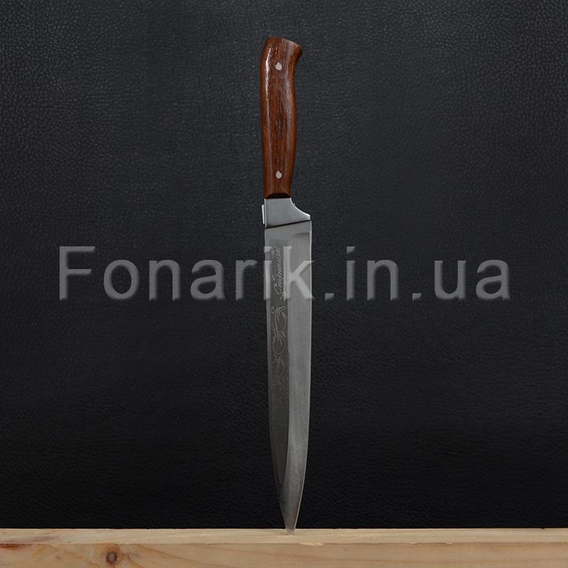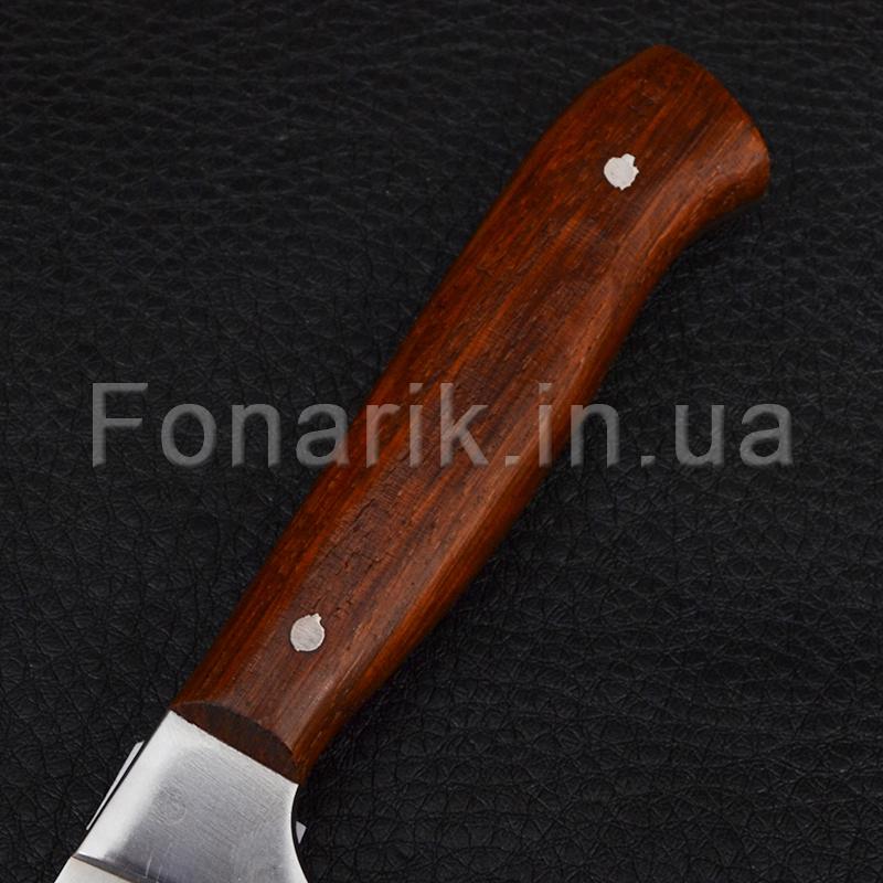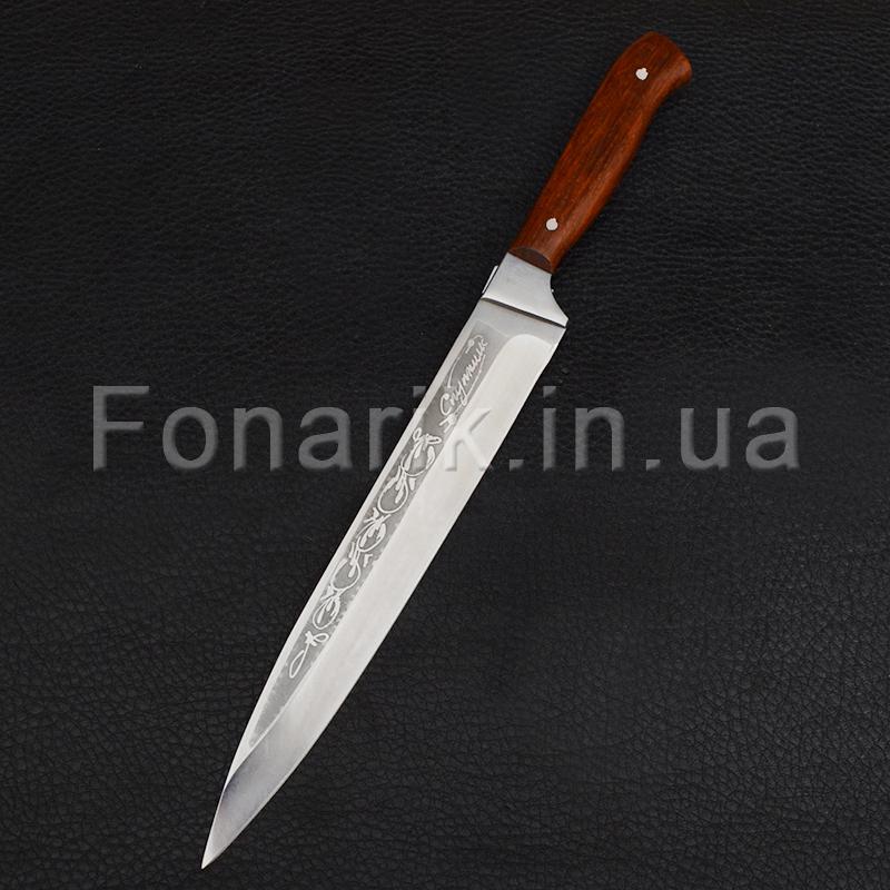 Нож разделочный Спутник имеет впечатляющий эргономичный дизайн, его приятно держать. Отлично продуманная рукоять ножа удобно лежит в руке, позволяет долго работать и не чувствовать усталости. Его размеры и качество говорят сами за себя. Клинок изготовлен из стали AISI 420. Общая длина ножа составляет 310мм, клинок 210мм. Притыном называется стальная накладка у основания лезвия, которая обеспечивает безопасность при работе с ножом и улучшает внешний вид.