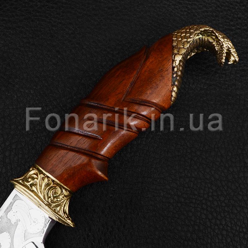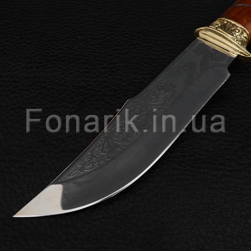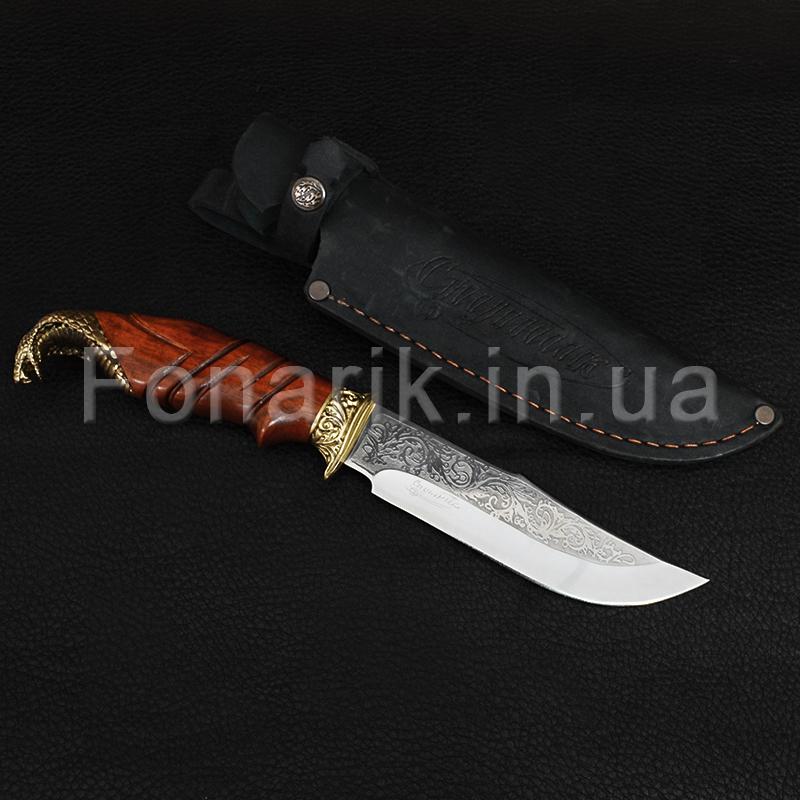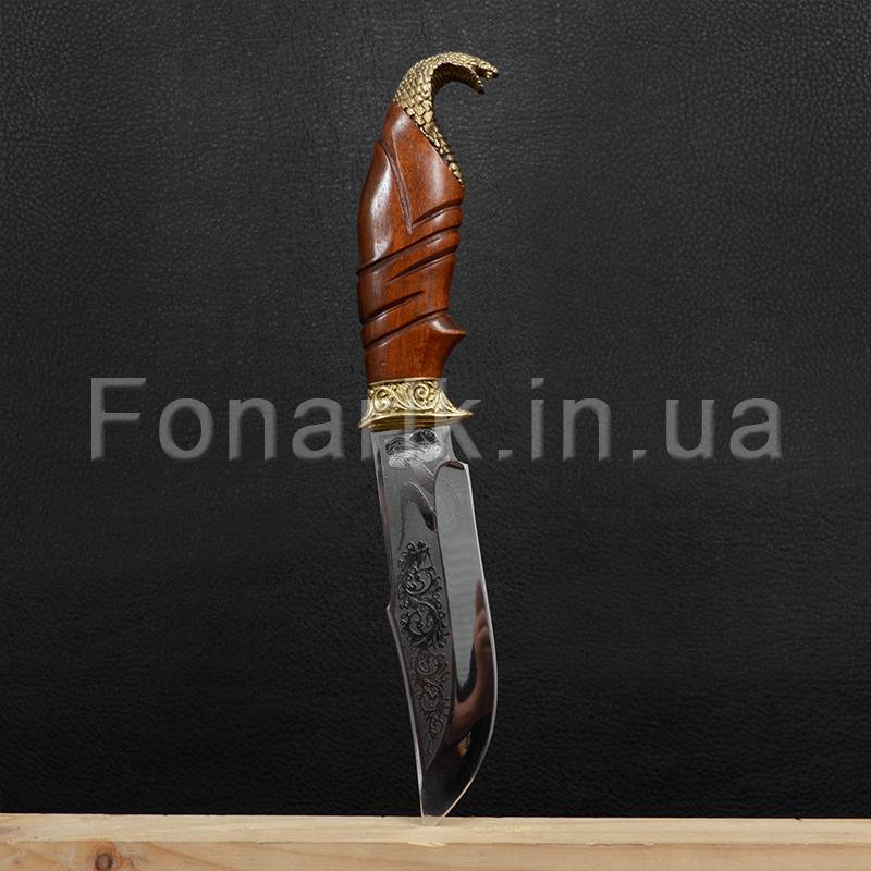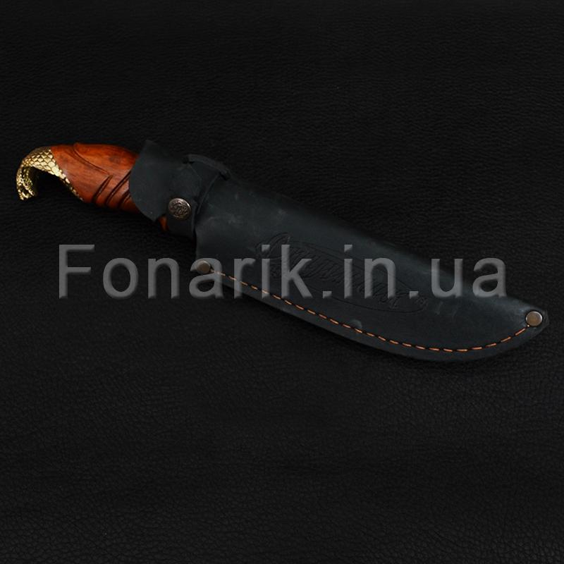Нож Спутник "Кобра" удобен и приятен в руке. Подойдет для использования для охоты, рыбалки или на пикнике. Выделяется среди других ножей своим приятным соотношением цена-качество. Клинок ножа изготовлен из стали AISI 420 (аналог 40Х13). Эта сталь обладает стойкостью режущей кромки, умеренной коррозионной стойкостью. Рукоять выполнена из ореха, имеется отверстие под темляк; клинок украшает гравировка. Кожаные ножны обеспечат сохранность ножа и удобную транспортировку.