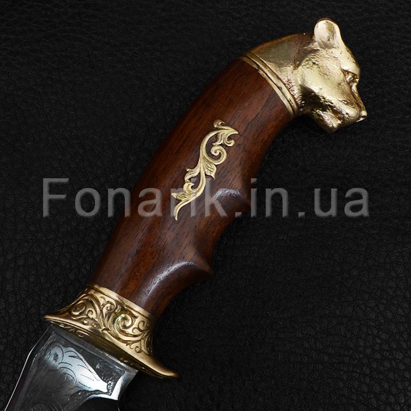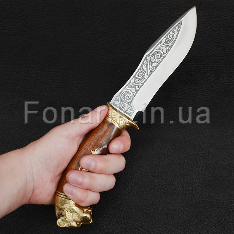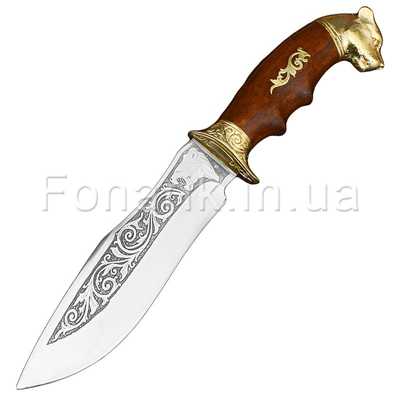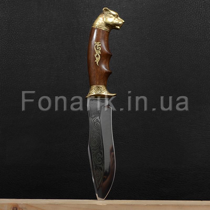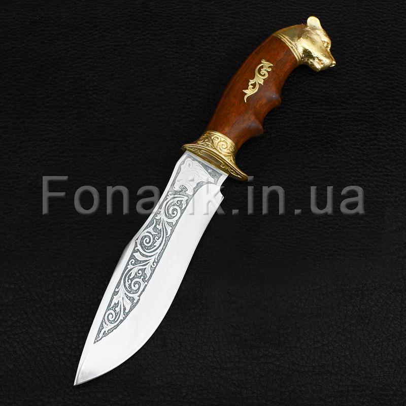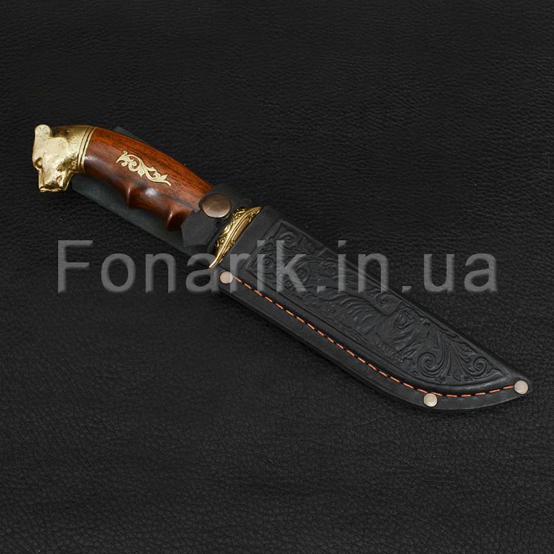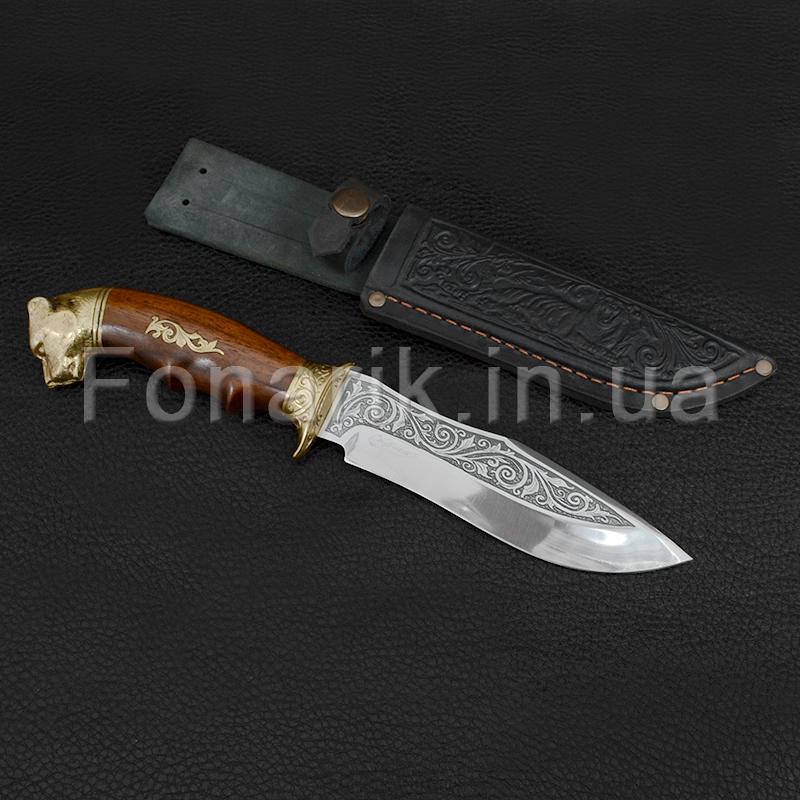 Клинок ножа Спутник "Пантера" выполнен из нержавеющей стали AISI 420. Твердость клинка 55HRC. Сталь устойчива к коррозии и хорошо держит заточку. Он станет для Вас незаменимым помощником на пикнике, охоте или рыбалке. На отполированном клинке выгравирован рисунок в виде пантеры. Рукоять сделана из ореха. В комплекте с ножом идут кожаные ножны и паспорт.