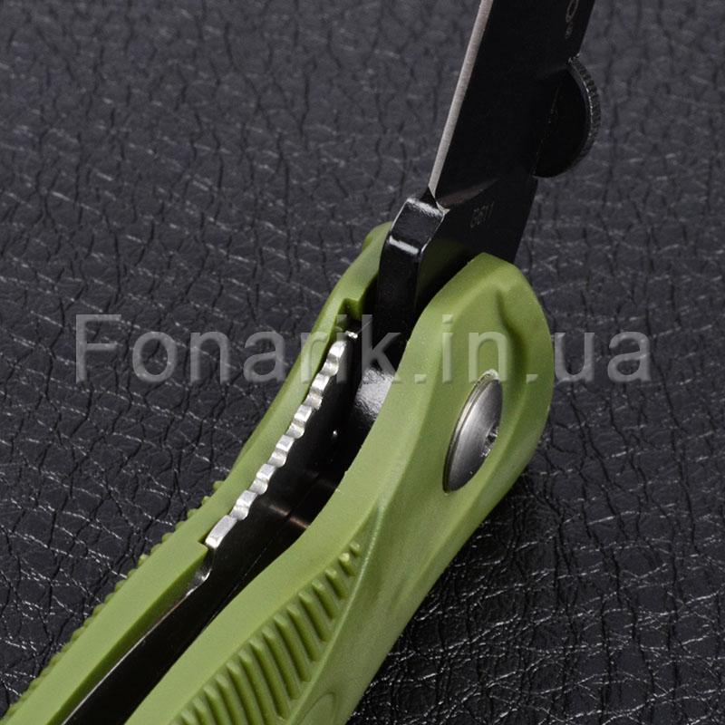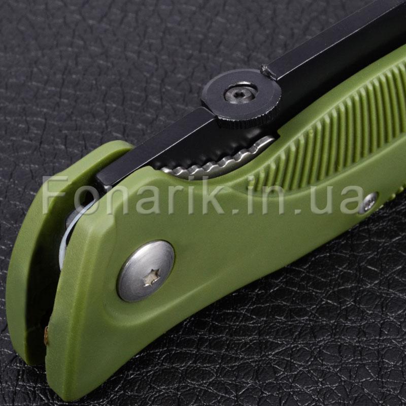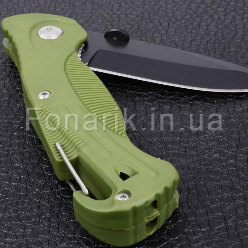 Лезвие ножа выполнена из нержавеющей стали 420С и имеет черное антибликовое покрытие. Благодаря высокому содержанию углерода, сталь 420С после термической обработки приобретает высокую твердость (58-60 HRC) и хорошо держит заточку. Рукоять ножа G611 имеет удобную эргономичную форму и выполнена из ударостойкого пластика зеленого цвета. Отличительной чертой модели G611 является наличие встроенного в рукоять свистка, который позволяет подать предупреждающий сигнал во время непредвиденной ситуации или опасности. Также на рукояти расположен карабин, позволяющий закрепить нож G611 на поясе или туристическом снаряжении. Замок Liner Lock надежно фиксирует клинок (как в открытом, так и в закрытом положении). Данная модель станет вашим незаменимым помощником во время отдыха на природе и в походах.