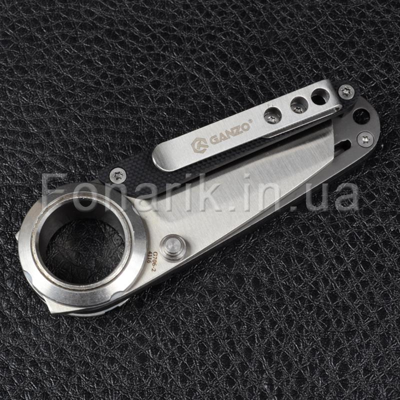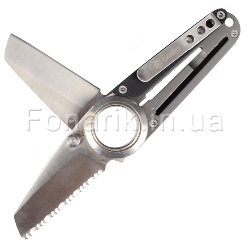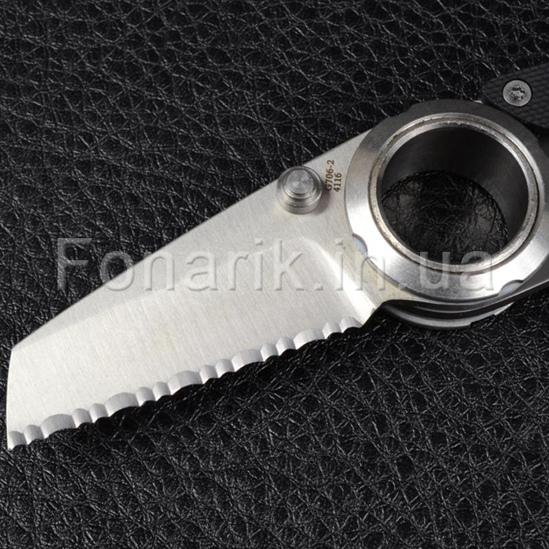Нож Ganzo G706-2 - в этом ноже 2 разных лезвия. Одно лезвие имеет серрейторную заточку, а второе - прямую, что превращает нож G706-2 в своеобразный инструмент, который способен выполнять более широкий круг задач, чем обычные складные ножи. Клинки ножа, изготовлен из нержавеющей стали марки 4116, предусматривает обычную заточку. Заявленная твердость клинка составляет 55 HRC. Каждое лезвие фиксируется индивидуальным замком Liner Lock. Рукоять выполнена из металла, который придает всей конструкции дополнительную жесткость. Металлическая клипса дает возможность надежно закрепить нож в кармане или на поясе.