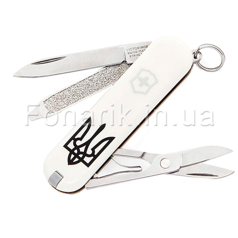 Нож Victorinox CLASSIC SD UKRAINE Трезубец - оригинальный, функциональный, качественный и легкий нож. Состоит из 7 функций. Такой нож станет приятным подарком для каждого мужчины и женщины. Нож радует не только функциональностью, но и своим креативным дизайном в украинском стиле. На плашке ножа нанесена символика Украины (Трезубец). Может быть использован как в быту так и на